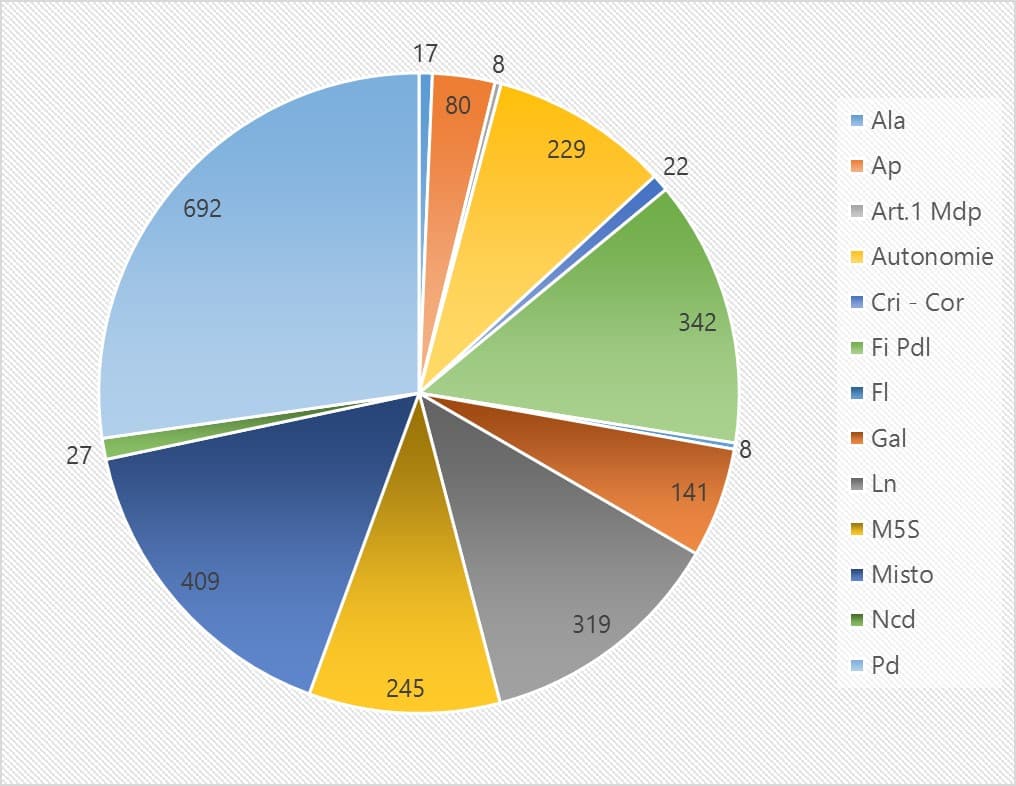 This study offers a first comprehensive answer through an analysis based on 3,600 indicators from the TESEO database of Senate bills. Almost half of these measures focused on justice and constitutional affairs, health, culture and pensions. Family and children come after armed forces, safety at work follows trade law. Foreign trade, local finance, Southern Italy and Energy are the least popular topics: all of them combined account for less than 1% of all bills submitted by parliamentary groups.