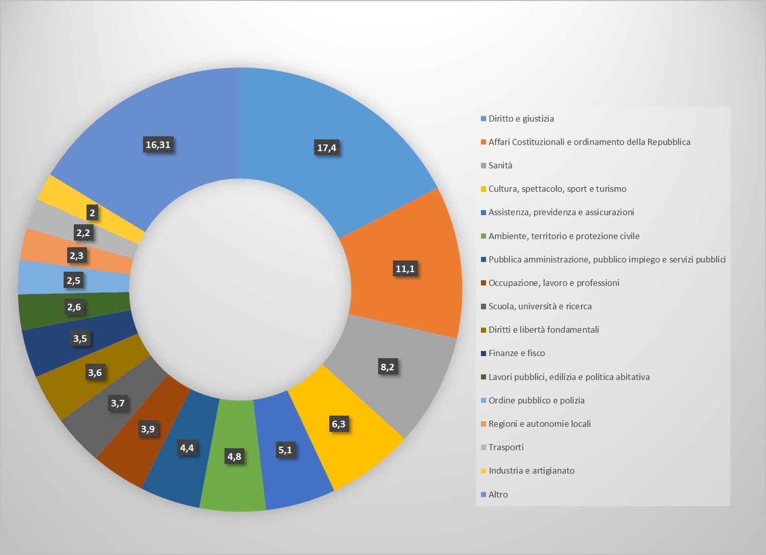 Il dossier offre la prima risposta sistematica attraverso l'analisi - basata sui 3.600 indicatori della banca dati Teseo - dei ddl depositati in Senato. Su giustizia e affari costituzionali, sanità, cultura e pensioni, si concentra quasi la meta (il 48,5%) dell'iniziativa parlamentare. Famiglia e infanzia vengono dopo le forze armate, la sicurezza sul lavoro dopo il diritto commerciale. E il commercio estero, la finanza locale, il Mezzogiorno e l'energia sono i temi meno considerati in assoluto: insieme non sono arrivati a coprire l'1% dell'intera proposta legislativa dei gruppi.