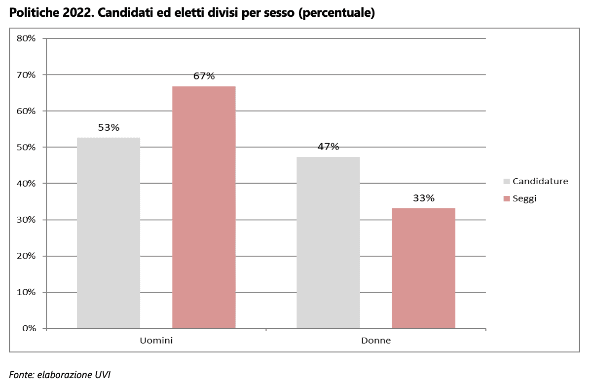 Nella I legislatura della Repubblica sono entrate 4 donne al Senato e 45 alla Camera: il 5%. Ci sono voluti quasi 30 anni (e altre sette legislature) perché nel 1976 fosse superata la soglia delle 50 presenze in Parlamento, e altri 30 anni per arrivare a quota 150. Nel 2022, a fronte di una riduzione del numero dei parlamentari, le urne hanno sostanzialmente confermato la tendenza, portando in Parlamento 198 donne. Oggi la presenza femminile, tra Camera e Senato, è pari al 33,6% degli eletti, una percentuale superiore alla media dei Parlamenti UE27.